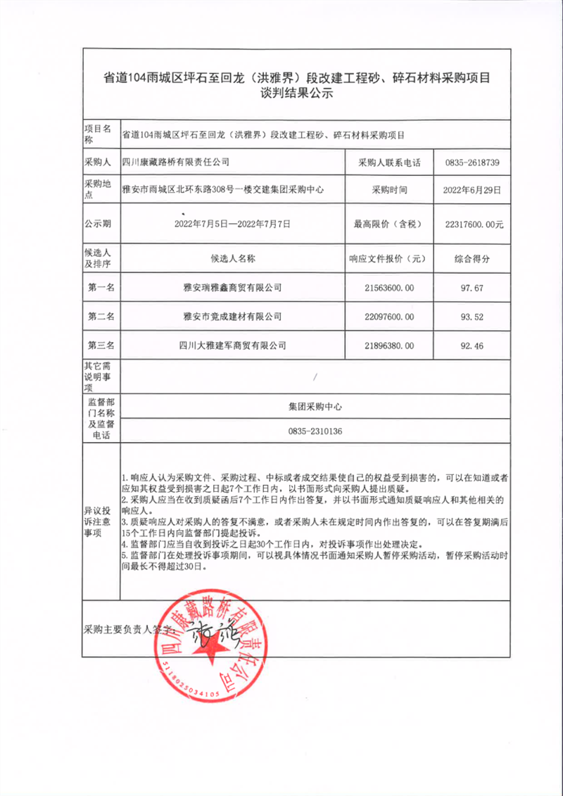 四川康藏路橋有限責(zé)任公司省道104雨城區(qū)坪石至回龍(洪雅界)段改建工程砂、碎石材料采購項(xiàng)目談判結(jié)果公示