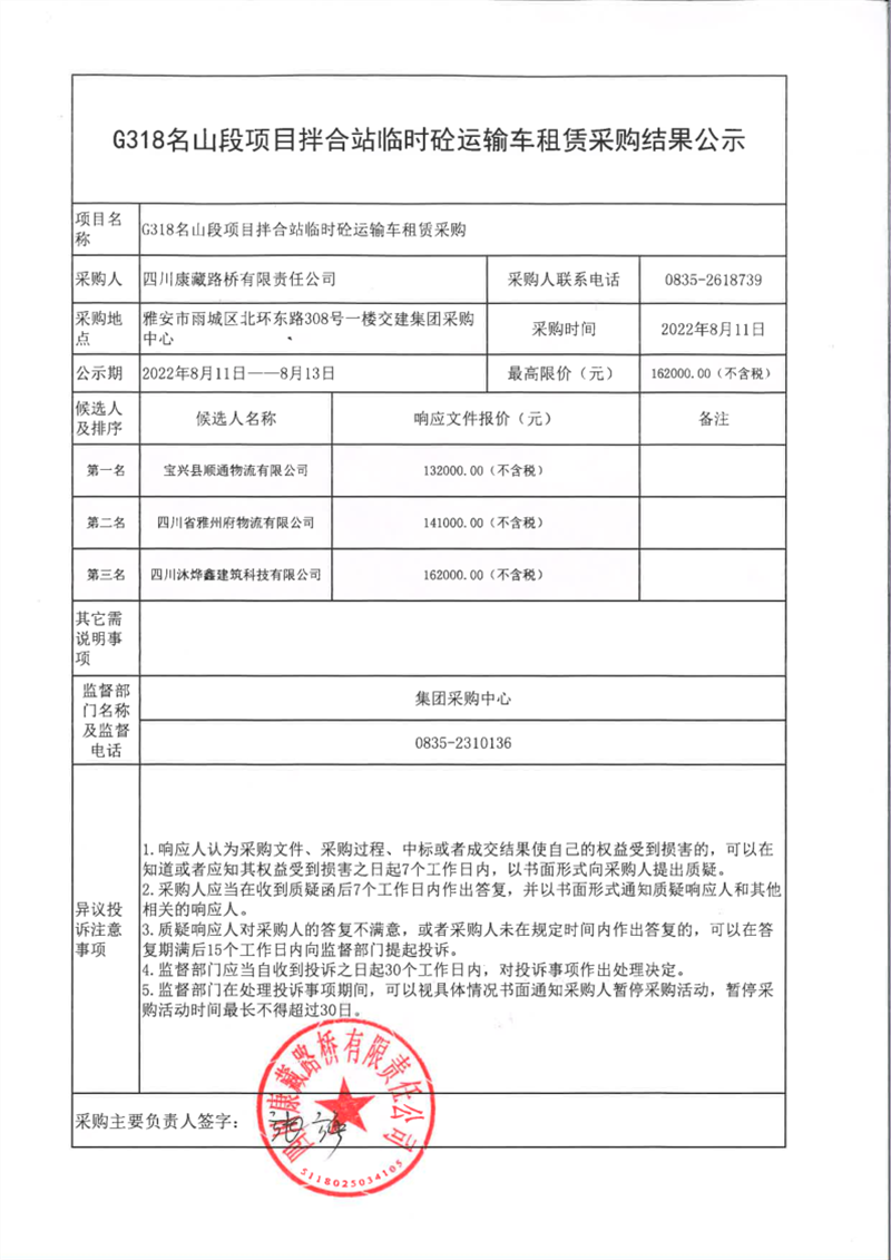四川康藏路橋有限責(zé)任公司G318名山段項(xiàng)目拌合站臨時砼運(yùn)輸車租賃采購結(jié)果公示