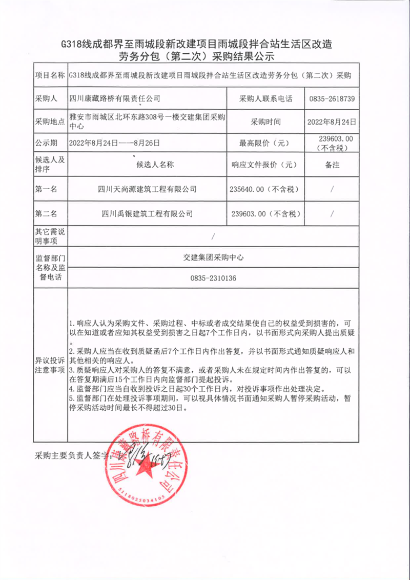 四川康藏路橋有限責(zé)任公司G318線成都界至雨城段新改建項(xiàng)目雨城段拌合站生活區(qū)改造勞務(wù)分包(第二次)采購結(jié)果公示