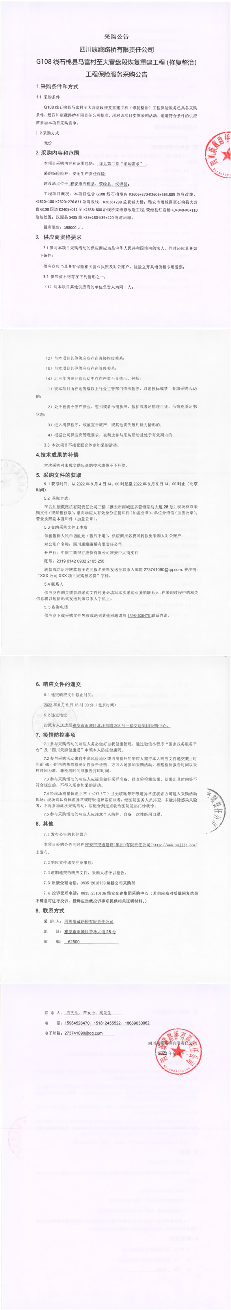 四川康藏路橋有限責(zé)任公司G108線石棉縣馬富村至大營(yíng)盤段恢復(fù)重建工程(修復(fù)整治)工程保險(xiǎn)服務(wù)采購(gòu)公告
