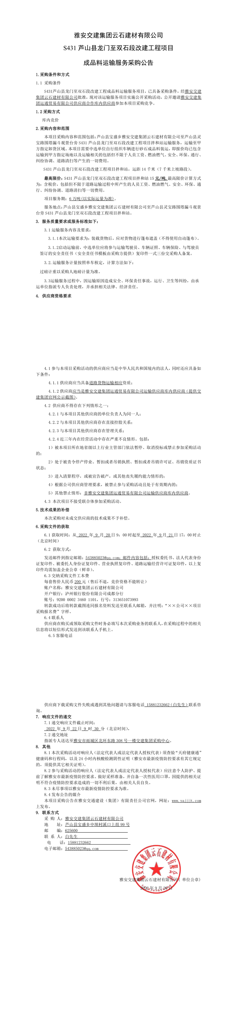 雅安交建集團(tuán)云石建材有限公司S431蘆山縣龍門至雙石段改建工程項(xiàng)目成品料運(yùn)輸服務(wù)采購(gòu)公告