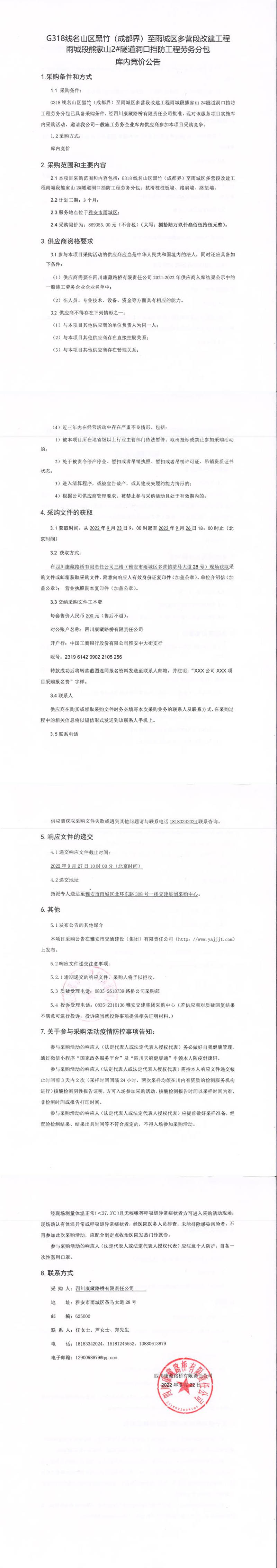 四川康藏路橋有限責任公司G318線名山區(qū)黑竹(成都界)至雨城區(qū)多營段改建工程雨城段熊家山2#隧道洞口擋防工程勞務(wù)分包庫內(nèi)競價公告