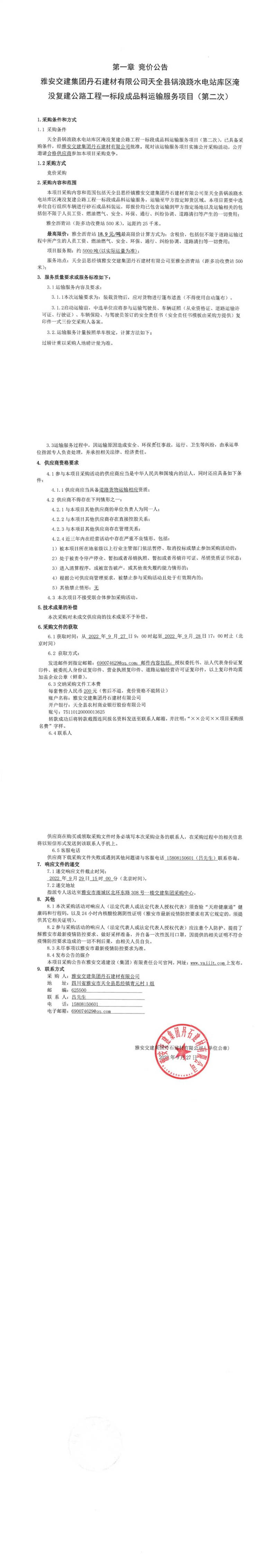 雅安交建集團丹石建材有限公司天全縣鍋浪蹺水電站庫區(qū)淹沒復(fù)建公路工程一標(biāo)段成品料運輸服務(wù)項目(第二次)競價公告