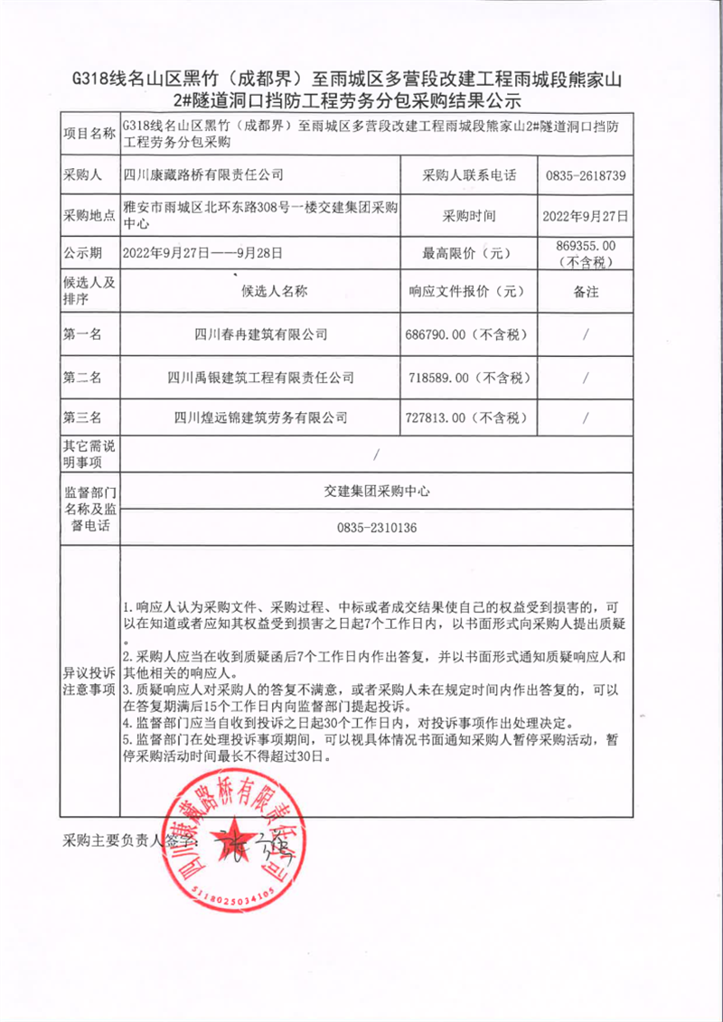 四川康藏路橋有限責(zé)任公司G318線(xiàn)名山區(qū)黑竹(成都界)至雨城區(qū)多營(yíng)段改建工程雨城段熊家山2#隧道洞口擋防工程勞務(wù)分包采購(gòu)結(jié)果公示