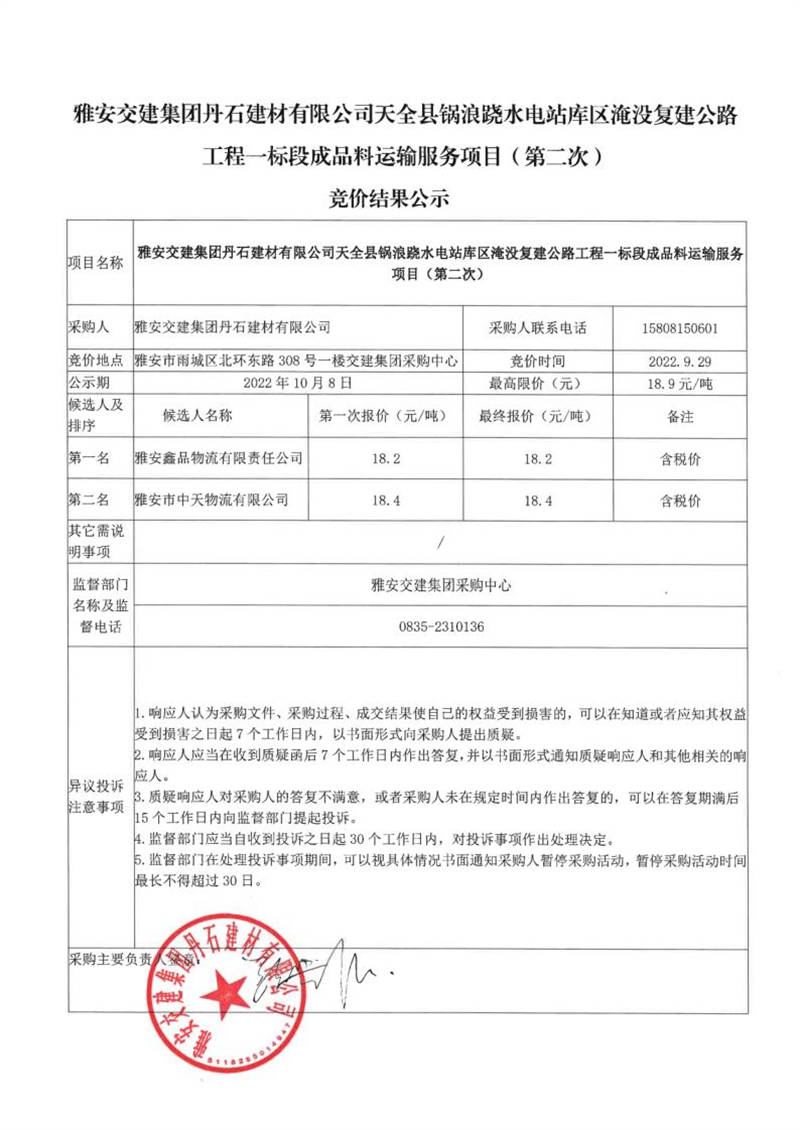 雅安交建集團丹石建材有限公司天全縣鍋浪蹺水電站庫區(qū)淹沒復(fù)建公路工程一標段成品料運輸服務(wù)項目(第二次)競價結(jié)果公示
