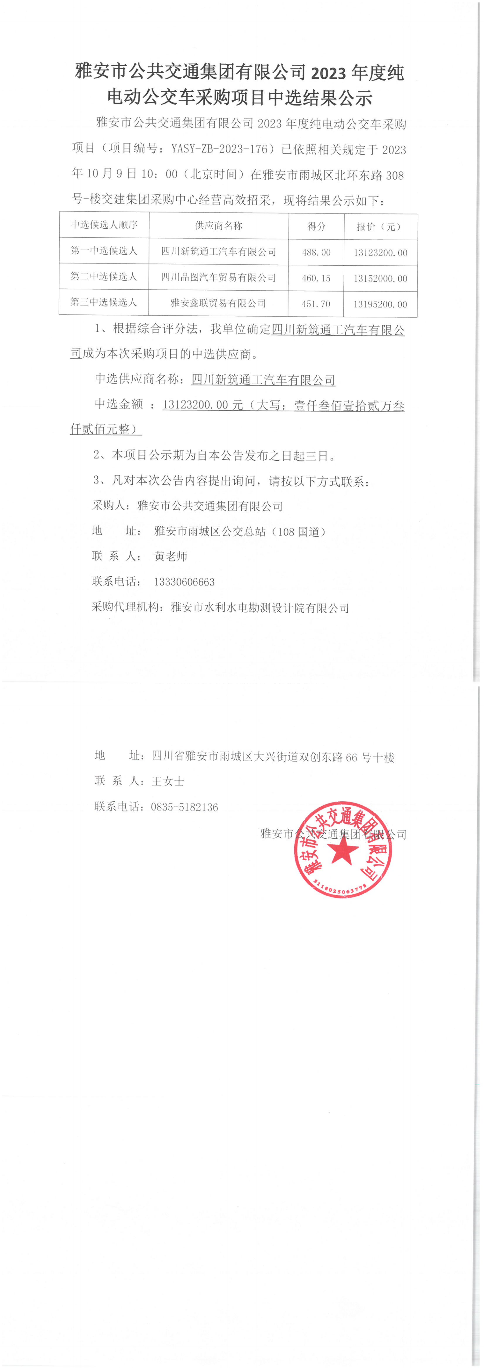 雅安市公共交通集團有限公司2023年度純電動公交車采購項目中選結(jié)果公示