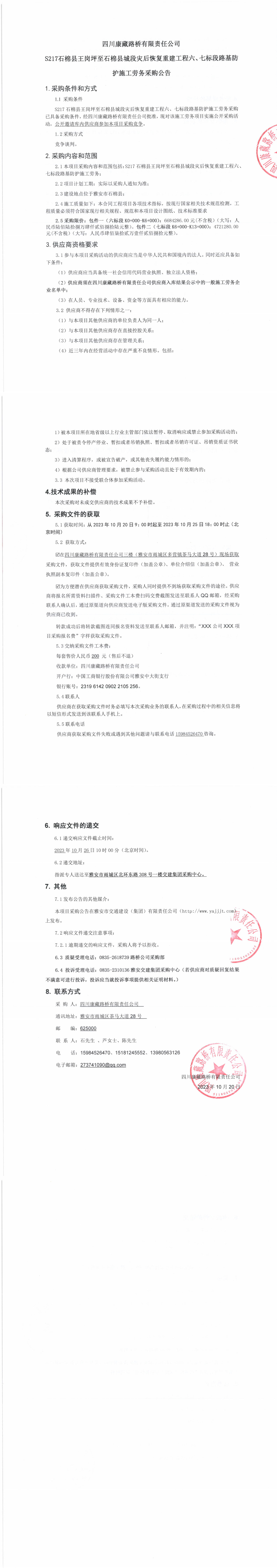 四川康藏路橋有限責(zé)任公司S217石棉縣王崗坪至石棉縣城段災(zāi)后恢復(fù)重建工程六、七標(biāo)段路基防護(hù)施工勞務(wù)采購(gòu)公告