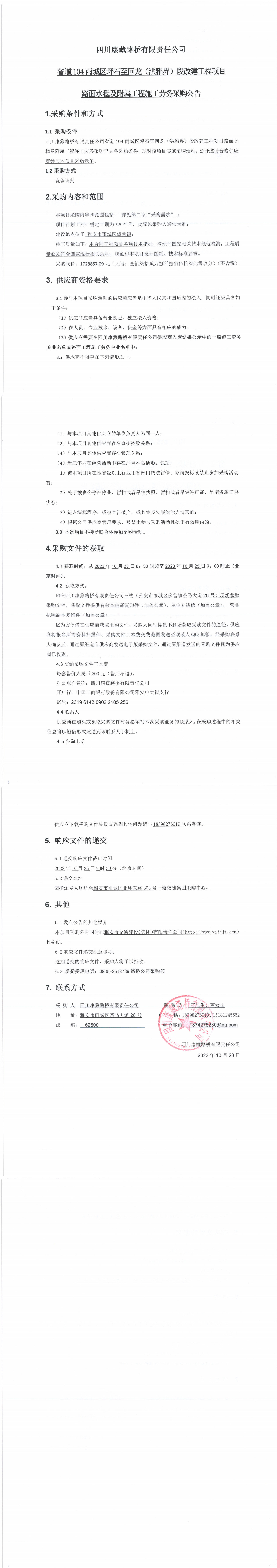 四川康藏路橋有限責(zé)任公司省道104雨城區(qū)坪石至回龍(洪雅界)段改建工程項(xiàng)目路面水穩(wěn)及附屬工程施工勞務(wù)采購公告