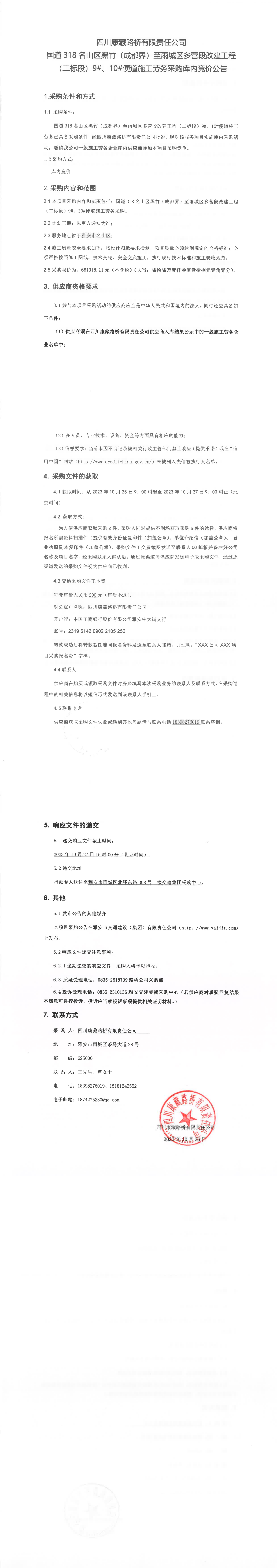 四川康藏路橋有限責(zé)任公司國道318名山區(qū)黑竹(成都界)至雨城區(qū)多營段改建工程(二標(biāo)段)9#、10#便道施工勞務(wù)采購庫內(nèi)競價(jià)公告