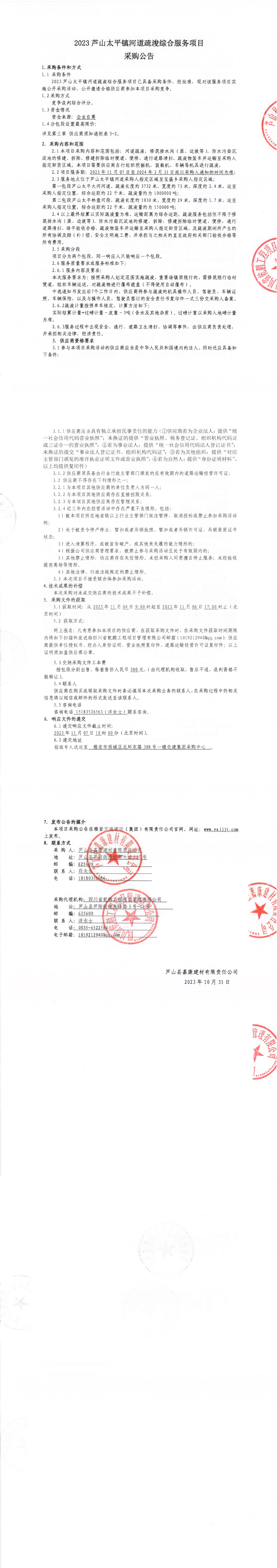蘆山縣嘉康建材有限責(zé)任公司2023蘆山太平鎮(zhèn)河道疏浚綜合服務(wù)項目采購公告