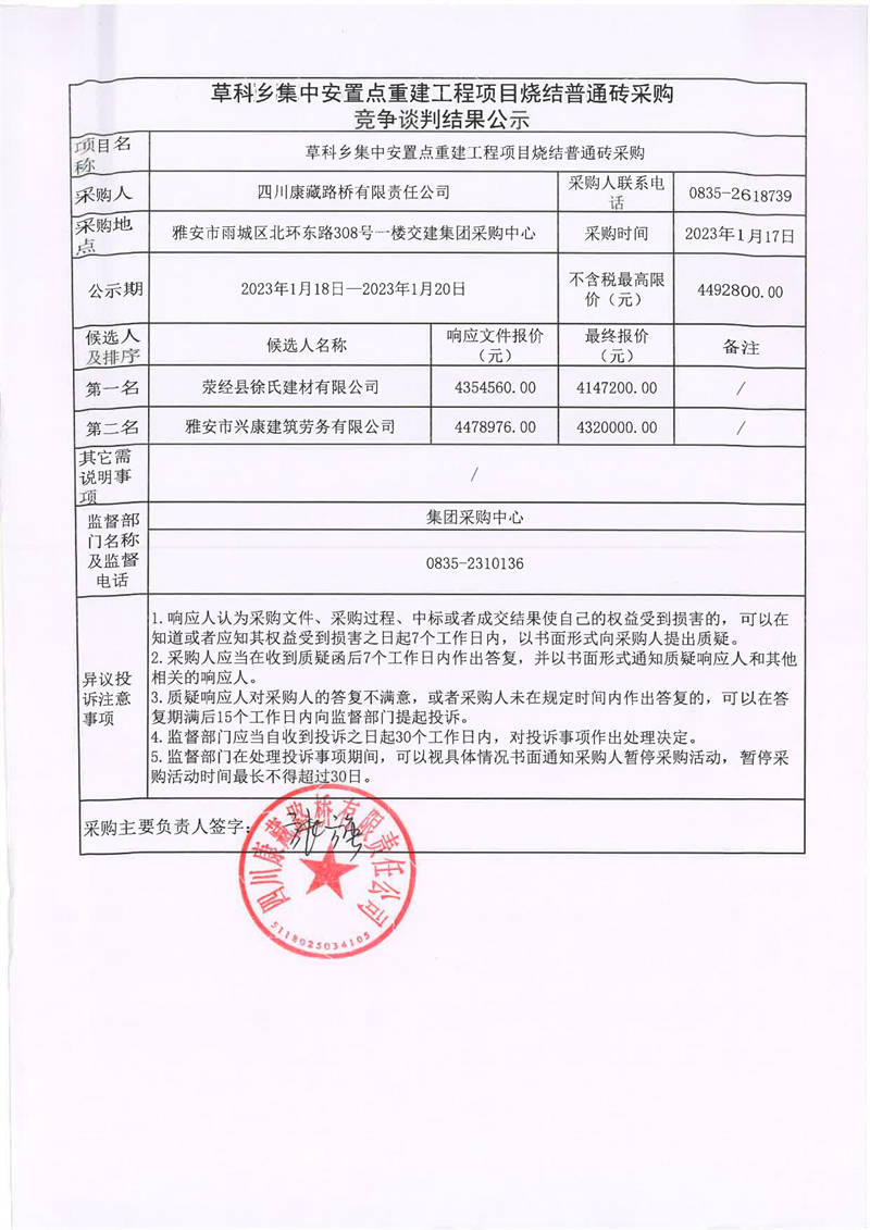 四川康藏路橋有限責(zé)任公司草科鄉(xiāng)集中安置點(diǎn)重建工程項(xiàng)目燒結(jié)普通磚采購(gòu)競(jìng)爭(zhēng)談判結(jié)果公示