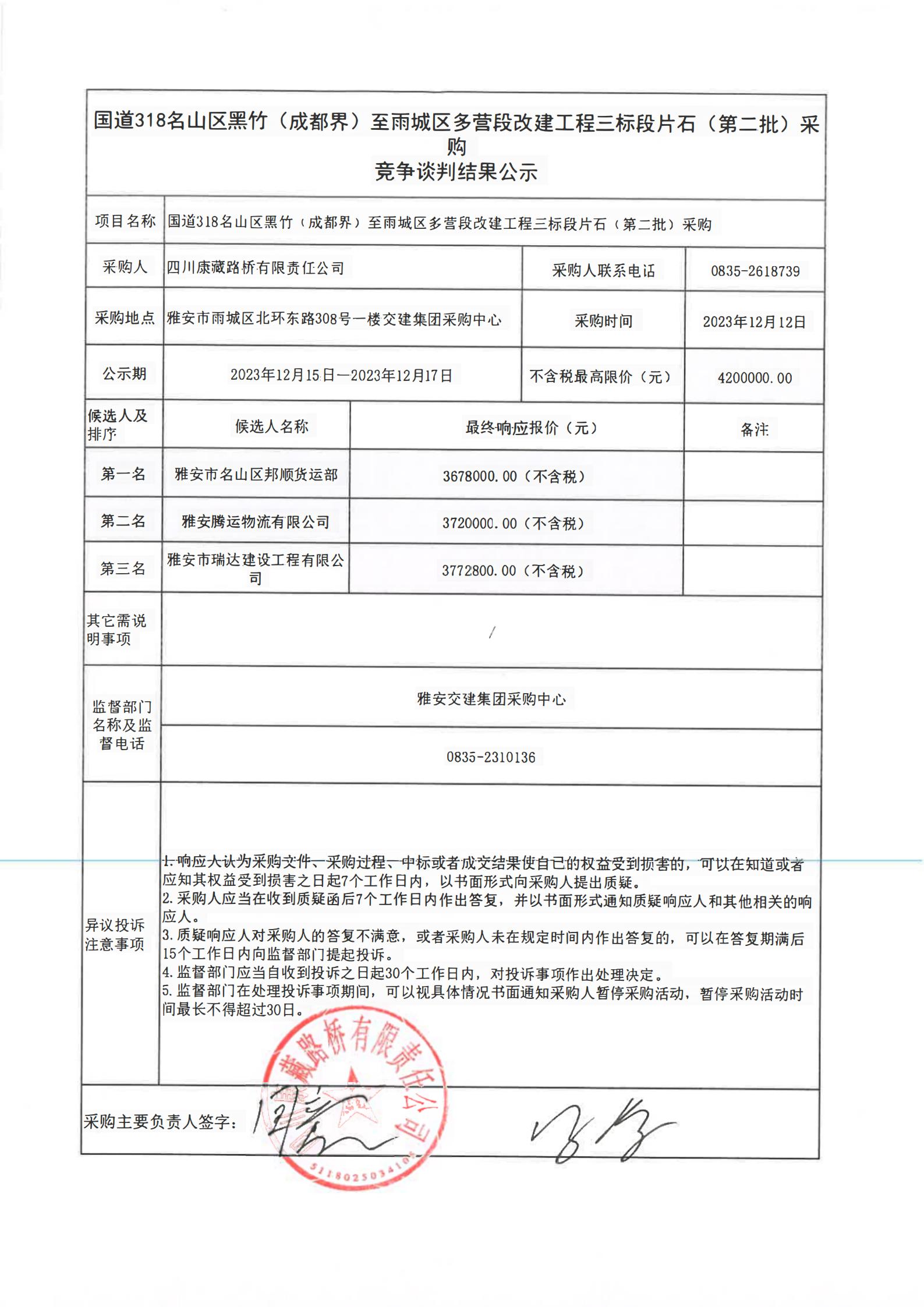 四川康藏路橋有限責任公司國道318名山區(qū)黑竹(成都界)至雨城區(qū)多營段改建工程三標段片石(第二批)采購競爭談判結(jié)果