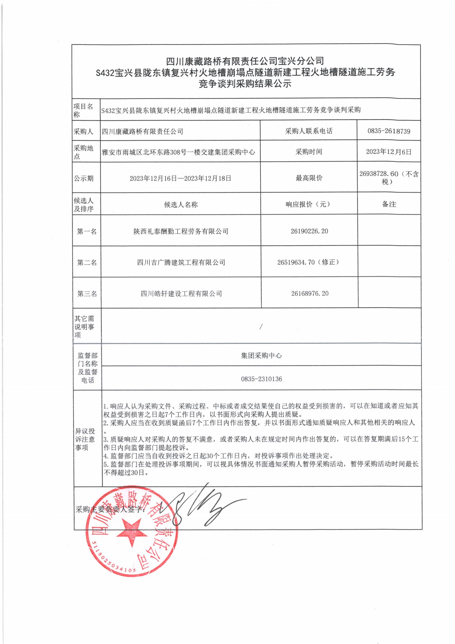 四川康藏路橋有限責(zé)任公司寶興分公司S432寶興縣隴東鎮(zhèn)復(fù)興村火地槽崩塌點(diǎn)隧道新建工程火地槽隧道施工勞務(wù)競(jìng)爭(zhēng)談判采購(gòu)結(jié)果公示