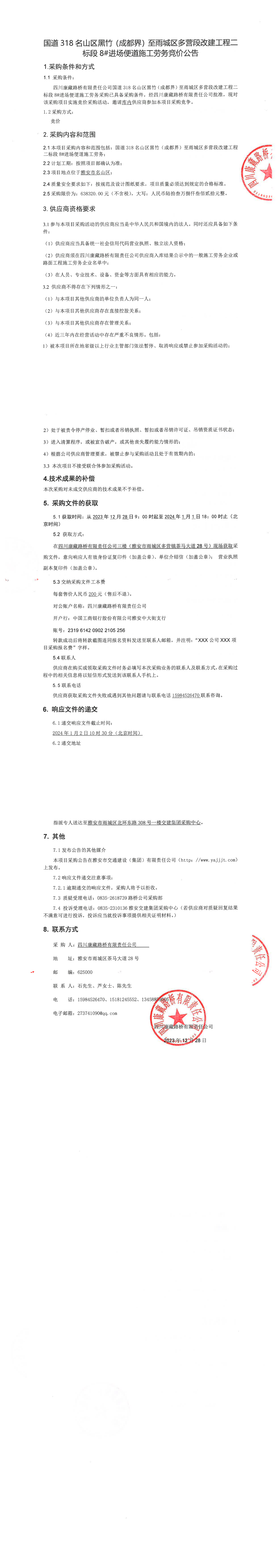 四川康藏路橋有限責任公司國道318名山區(qū)黑竹(成都界)至雨城區(qū)多營段改建工程二標段8#進場便道施工勞務(wù)競價公告
