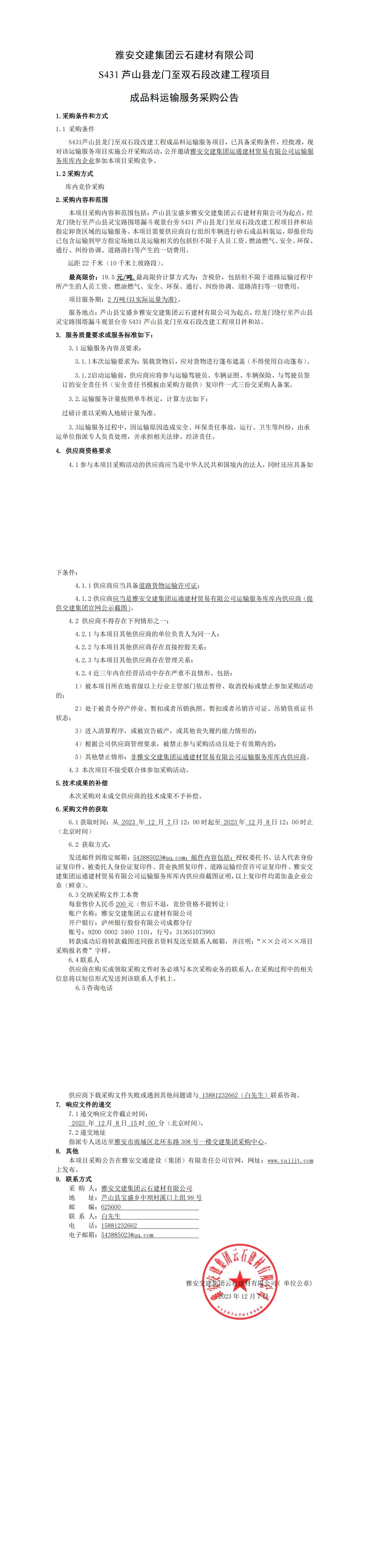 雅安交建集團云石建材有限公司S431蘆山縣龍門至雙石段改建工程項目成品料運輸服務(wù)采購公告