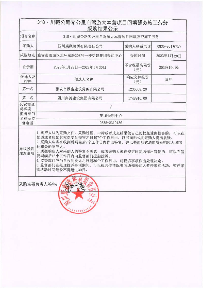 四川康藏路橋有限責(zé)任公司318.川藏公路零公里自駕游大本營(yíng)項(xiàng)目回填強(qiáng)夯施工勞務(wù)采購(gòu)結(jié)果公示