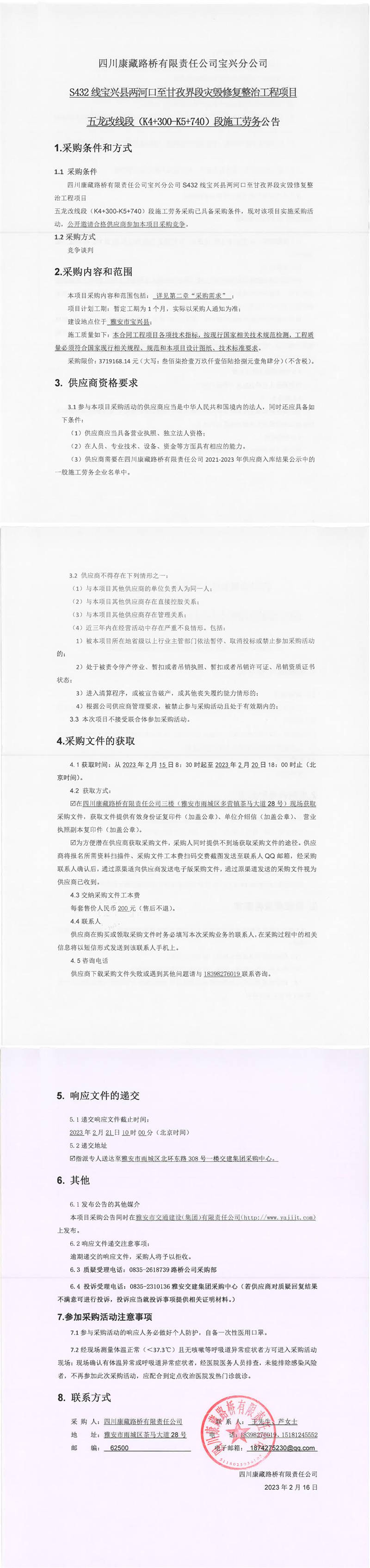 四川康藏路橋有限責任公司S432線寶興縣兩河口至甘孜界段災毀修復整治工程項目五龍改線段(K4+300-K5+740)段施工勞務公告