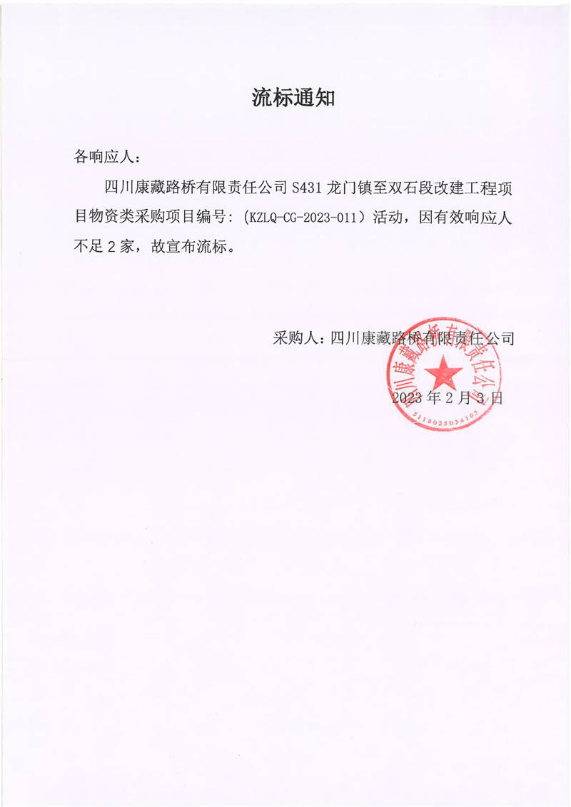 四川康藏路橋有限責(zé)任公司S431龍門(mén)鎮(zhèn)至雙石段改建工程項(xiàng)目物資類(lèi)采購(gòu)流標(biāo)通知