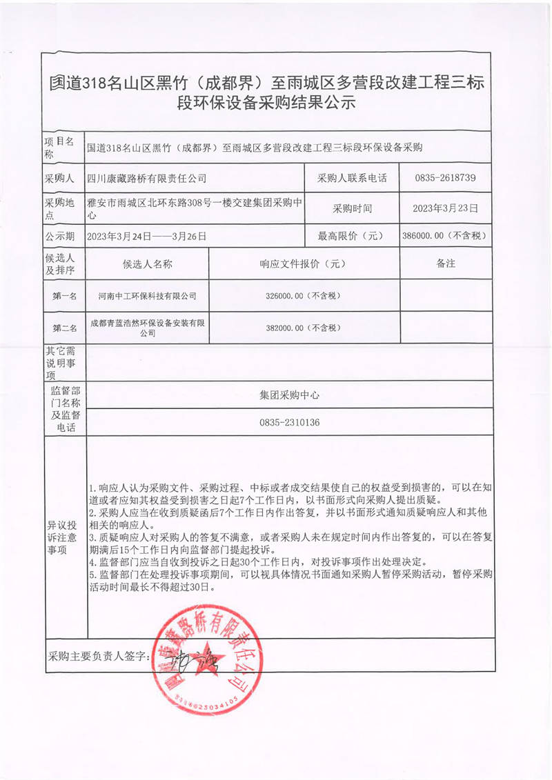 四川康藏路橋有限責(zé)任公司國(guó)道318名山區(qū)黑竹(成都界)至雨城區(qū)多營(yíng)段改建工程三標(biāo)段環(huán)保設(shè)備采購(gòu)結(jié)果公示