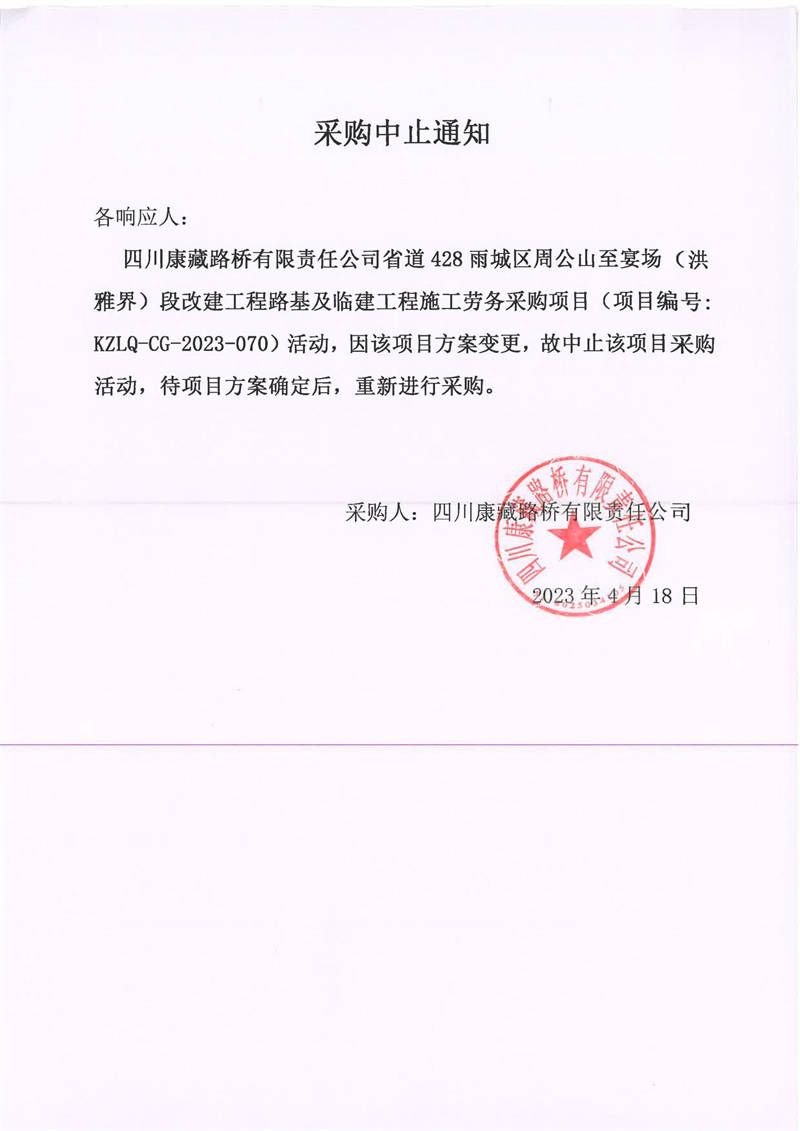 四川康藏路橋有限責(zé)任公司省道428雨城區(qū)周公山至宴場(chǎng)(洪雅界)段改建工程路基及臨建工程施工勞務(wù)采購(gòu)項(xiàng)目采購(gòu)中止通知