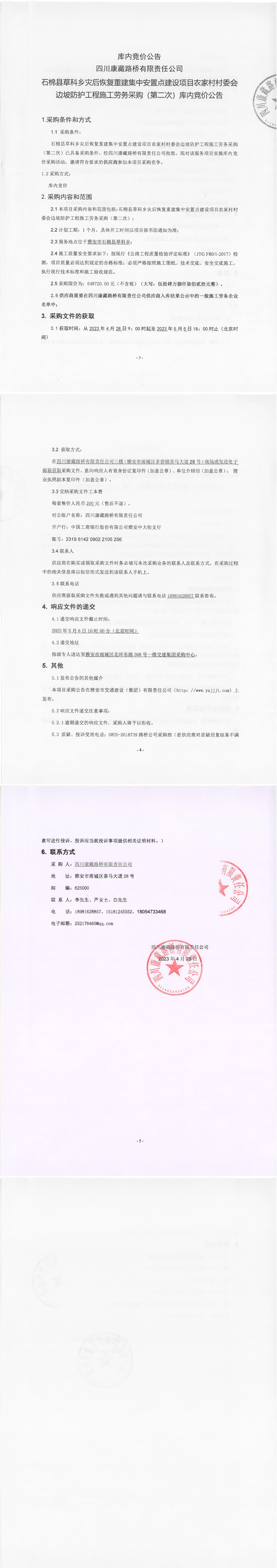 四川康藏路橋有限責任公司石棉草科鄉(xiāng)災(zāi)后恢復(fù)重建集中安置點建設(shè)項目農(nóng)家村村委會邊坡防護工程施工勞務(wù)采購(第二次)庫內(nèi)競價公告