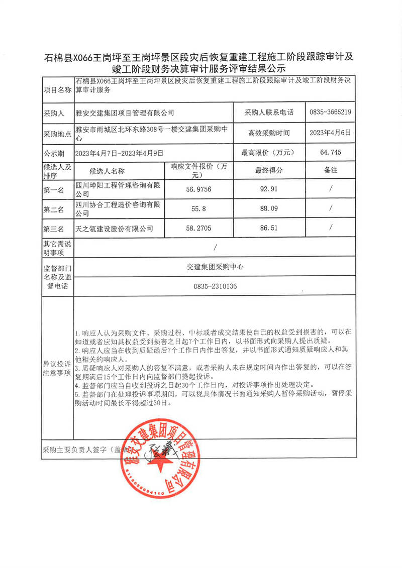 雅安交建集團項目管理有限公司石棉縣X066王崗坪至王崗坪景區(qū)段災(zāi)后恢復(fù)重建工程施工階段跟蹤審計及竣工階段財務(wù)決算審計服務(wù)評審結(jié)果公示