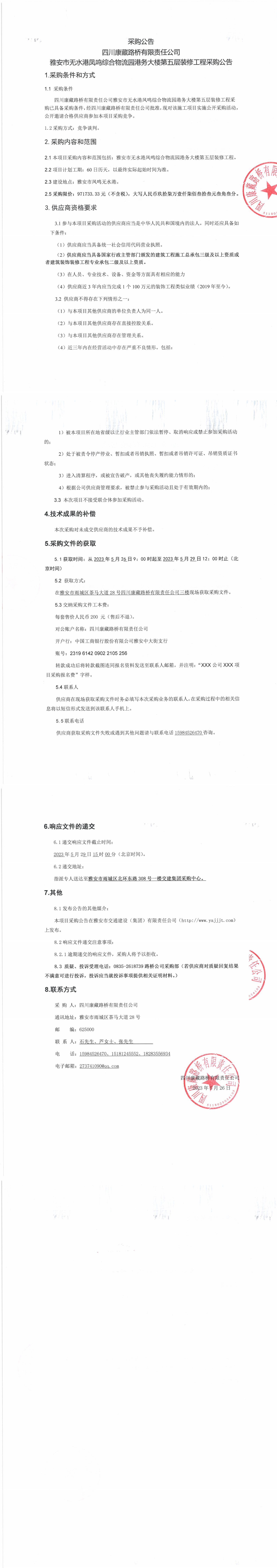 四川康藏路橋有限責任公司雅安市無水港鳳鳴綜合物流園港務(wù)大樓第五層裝修工程采購公告