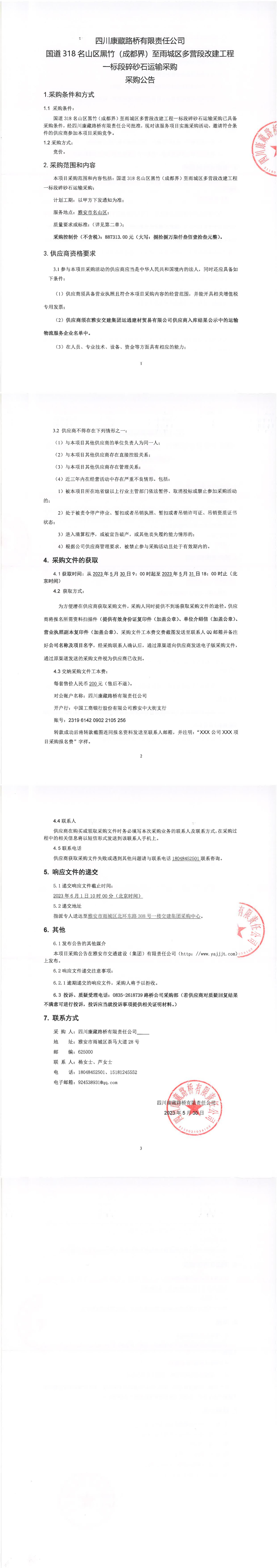 四川康藏路橋有限責(zé)任公司國(guó)道318名山區(qū)黑竹(成都界)至雨城區(qū)多營(yíng)段改建工程一標(biāo)段碎砂石運(yùn)輸采購(gòu)公告