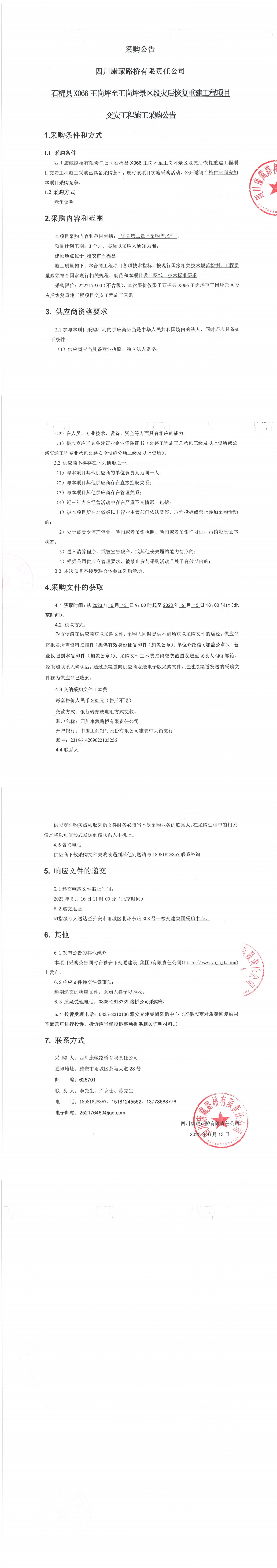 四川康藏路橋有限責任公司石棉縣X066王崗坪至王崗坪景區(qū)段災后恢復重建工程項目交安工程施工采購公告