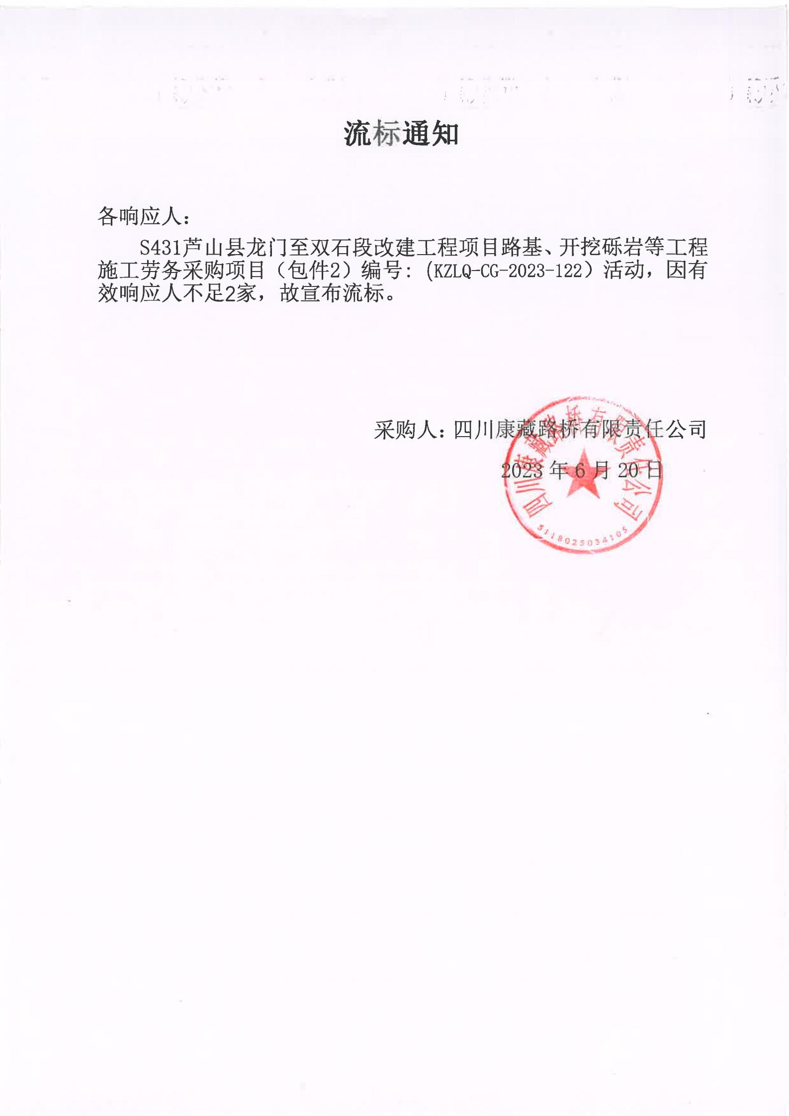 四川康藏路橋有限責(zé)任公司S431蘆山縣龍門(mén)至雙石段改建工程項(xiàng)目路基、開(kāi)挖礫巖等工程施工勞務(wù)采購(gòu)(包件2)流標(biāo)通知