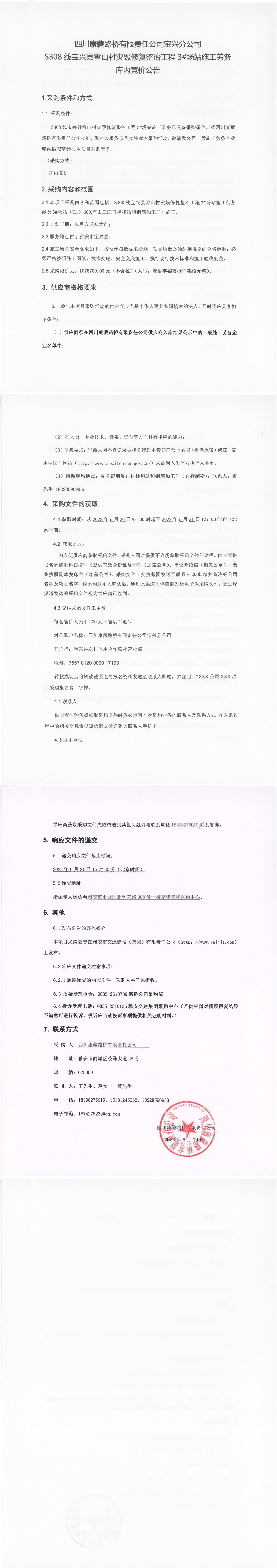 四川康藏路橋有限責任公司寶興分公司S308線寶興縣雪山村災(zāi)毀整治工程3#場站施工勞務(wù)庫內(nèi)競價公告