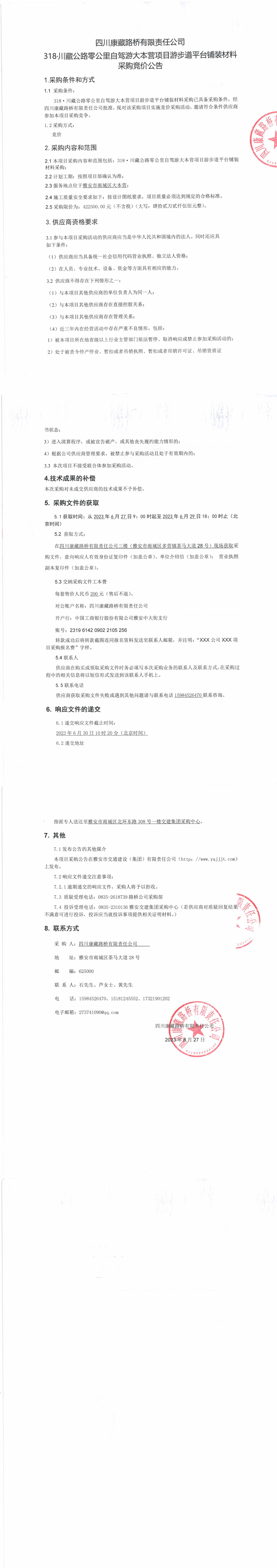 四川康藏路橋有限責(zé)任公司318·川藏公路零公里自駕游大本營項(xiàng)目步游道平臺(tái)鋪裝材料采購競(jìng)價(jià)公告