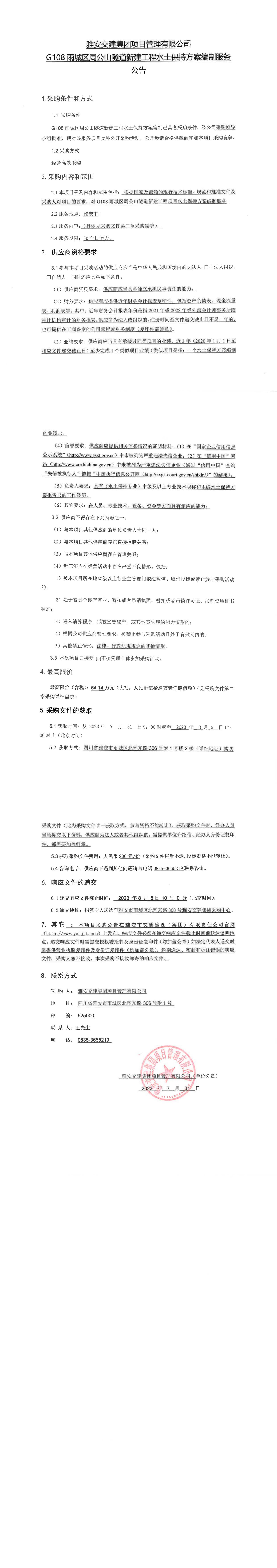 雅安交建集團(tuán)項目管理有限公司G108雨城區(qū)周公山隧道新建工程水土保持方案編制服務(wù)公告