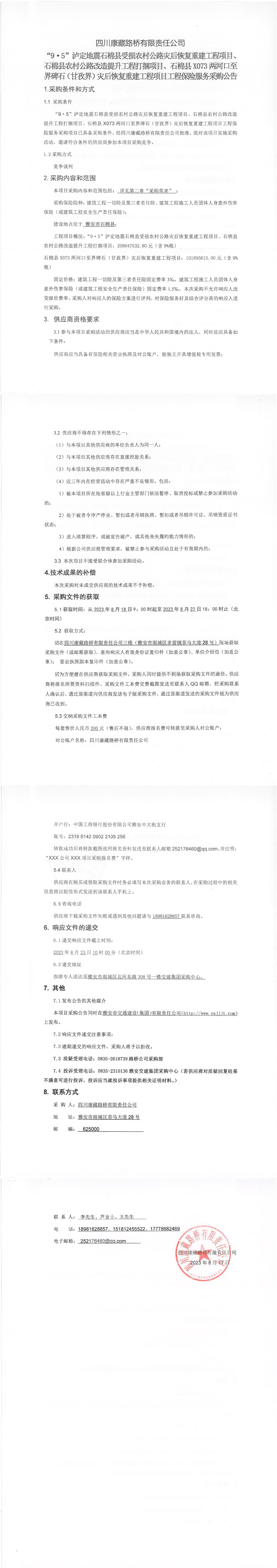 四川康藏路橋有限責(zé)任公司“9·5”瀘定地震石棉縣受損農(nóng)村公路災(zāi)后恢復(fù)重建工程項(xiàng)目、石棉縣農(nóng)村公路改造提升工程打捆項(xiàng)目、石棉縣X073兩河口至界碑石(甘孜界)災(zāi)后恢復(fù)重建工程項(xiàng)目工程保險服務(wù)采購公告