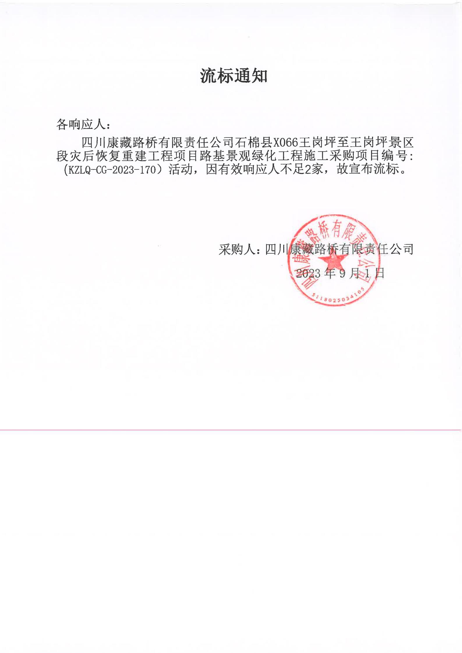 四川康藏路橋有限責(zé)任公司石棉縣X066王崗坪至王崗坪景區(qū)段災(zāi)后恢復(fù)重建工程項(xiàng)目路基景觀綠化工程施工采購流標(biāo)通知