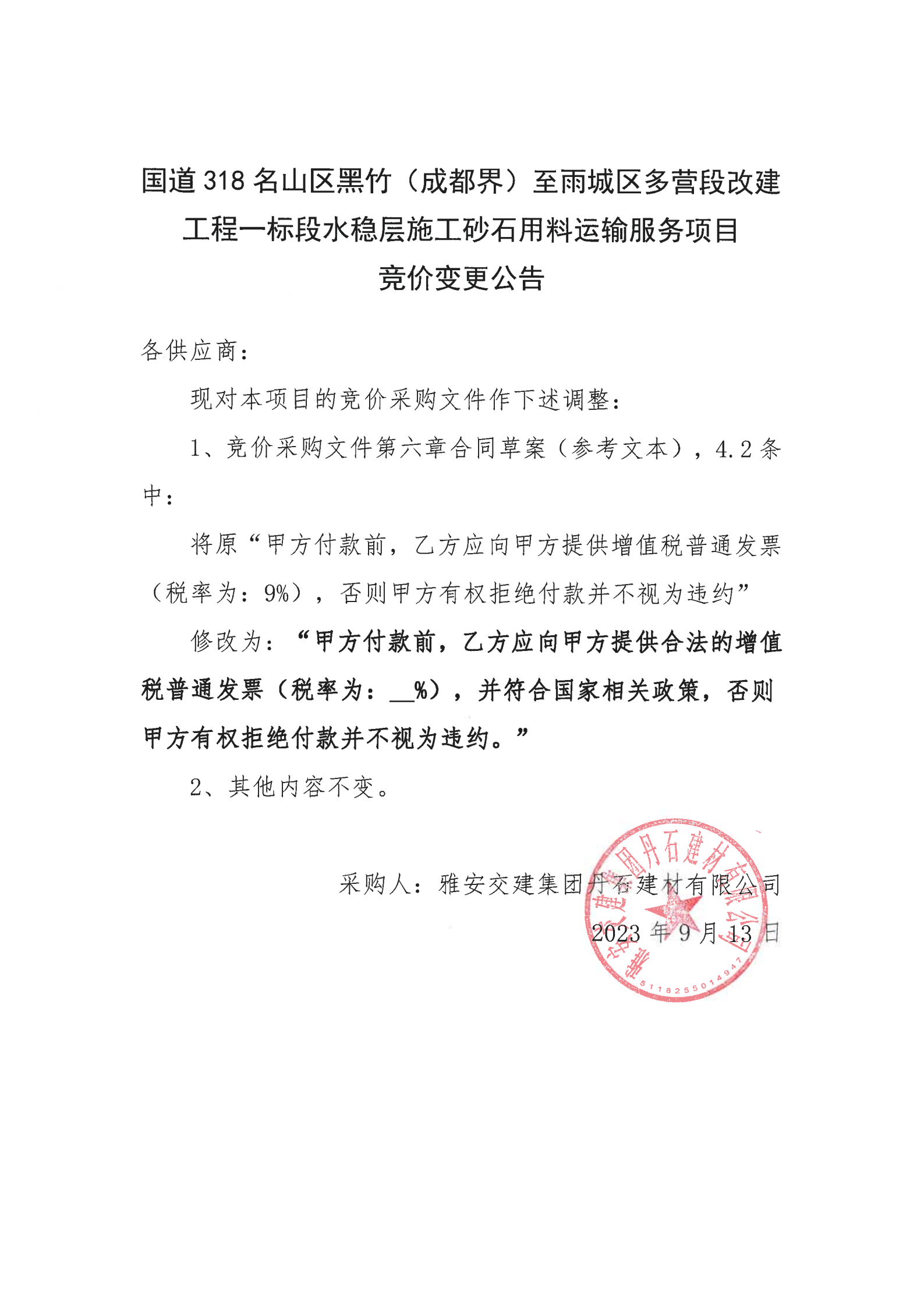 雅安交建集團(tuán)丹石建材有限公司國道318名山區(qū)黑竹(成都界)至雨城區(qū)多營段改建工程一標(biāo)段水穩(wěn)層施工砂石用料運(yùn)輸服務(wù)項(xiàng)目競價變更公告