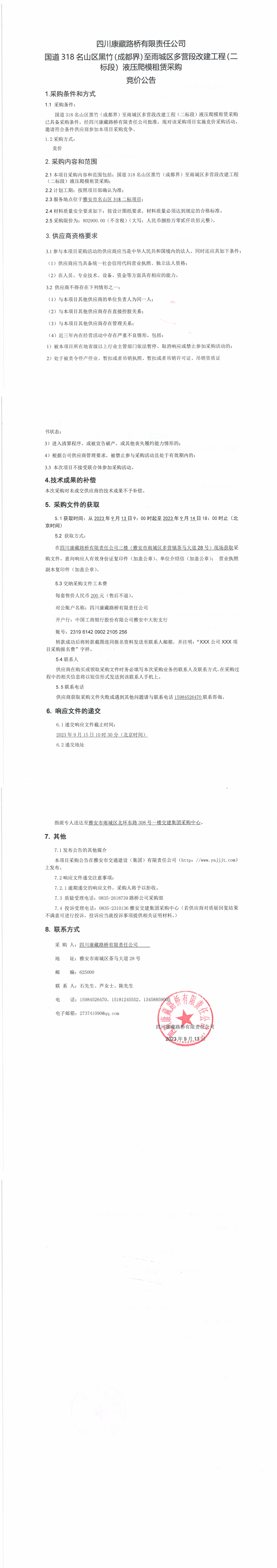 四川康藏路橋有限責(zé)任公司國道318名山區(qū)黑竹(成都界)至雨城區(qū)多營段改建工程(二標(biāo)段)液壓爬模租賃采購競價(jià)公告