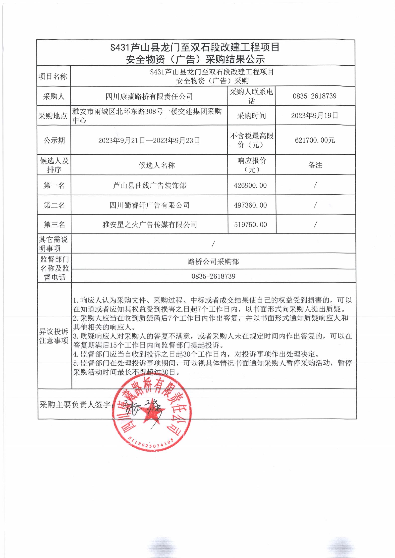 四川康藏路橋有限責(zé)任公司S431蘆山縣龍門至雙石段改建工程項目安全物資(廣告)采購結(jié)果公示