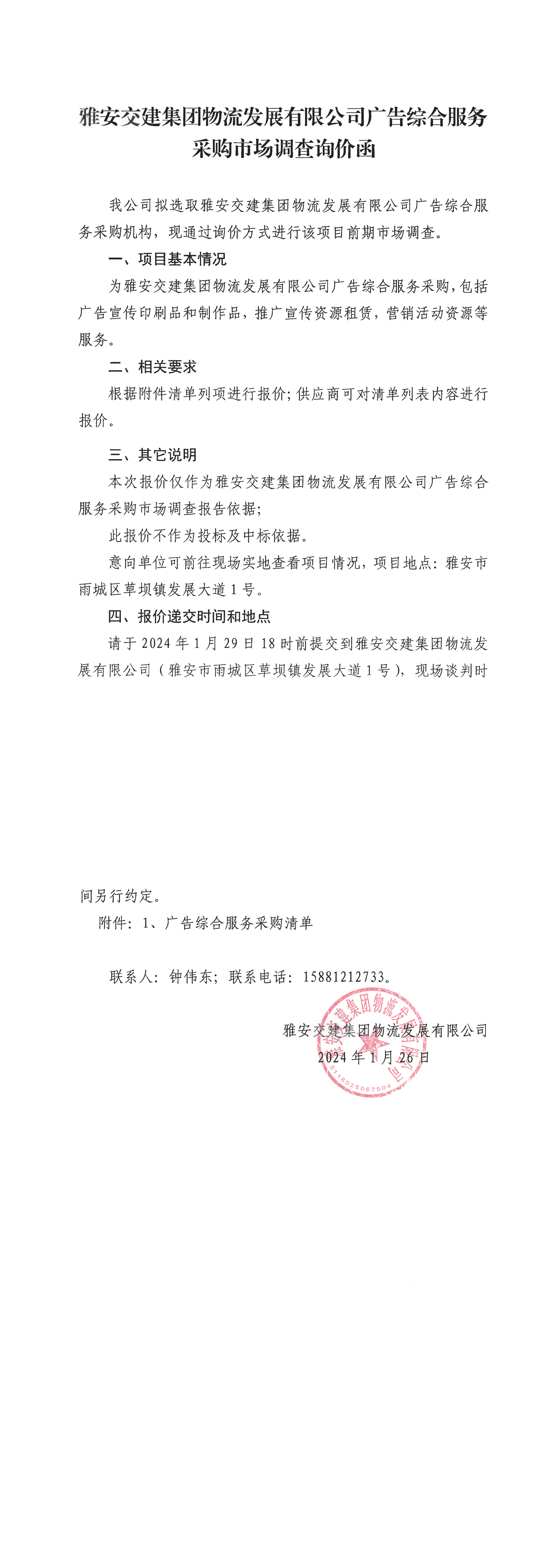 雅安交建集團(tuán)物流發(fā)展有限公司廣告綜合服務(wù)采購市場(chǎng)調(diào)查詢價(jià)函