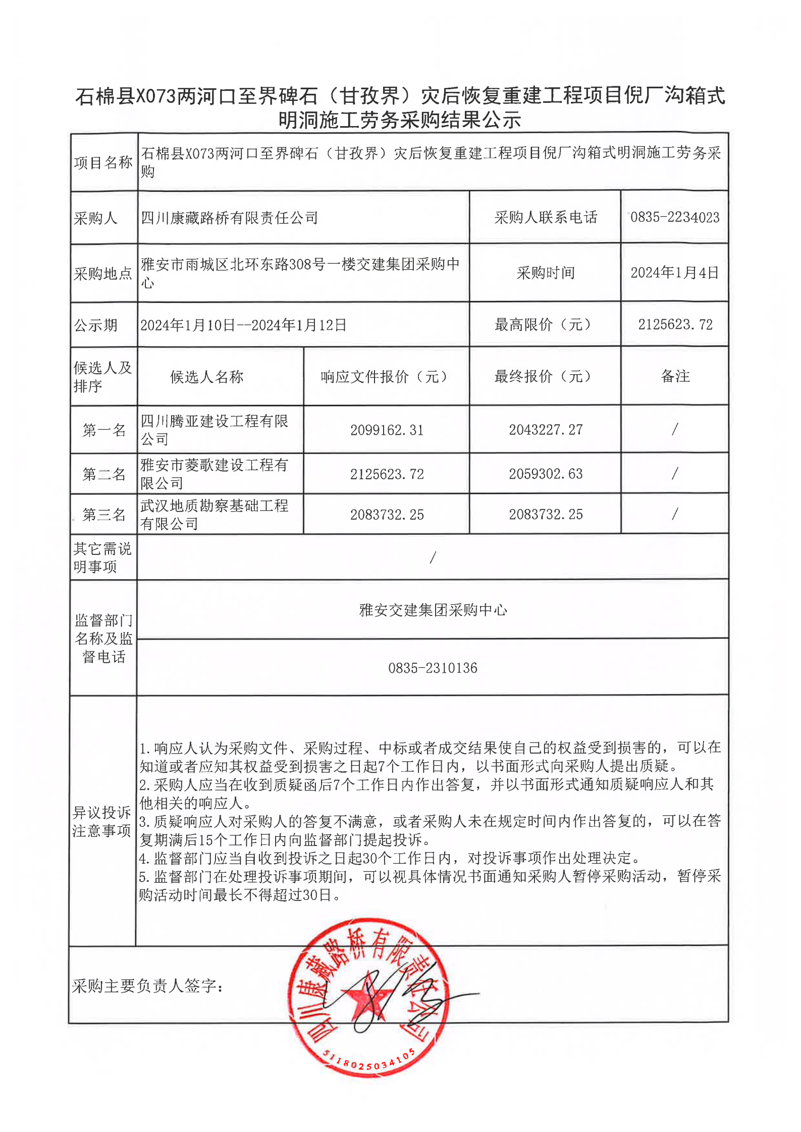 四川康藏路橋有限責(zé)任公司石棉縣X073兩河口至界碑石(甘孜界)災(zāi)后恢復(fù)重建工程項(xiàng)目倪廠溝箱式明洞施工勞務(wù)采購(gòu)結(jié)果公示
