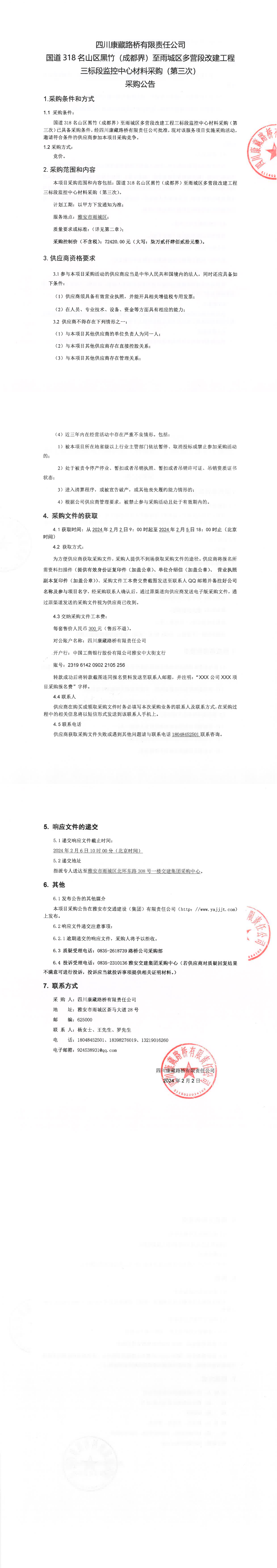 四川康藏路橋有限責(zé)任公司國道318名山區(qū)黑竹(成都界)至雨城區(qū)多營段改建工程三標(biāo)段監(jiān)控中心材料采購(第三次)采購公告