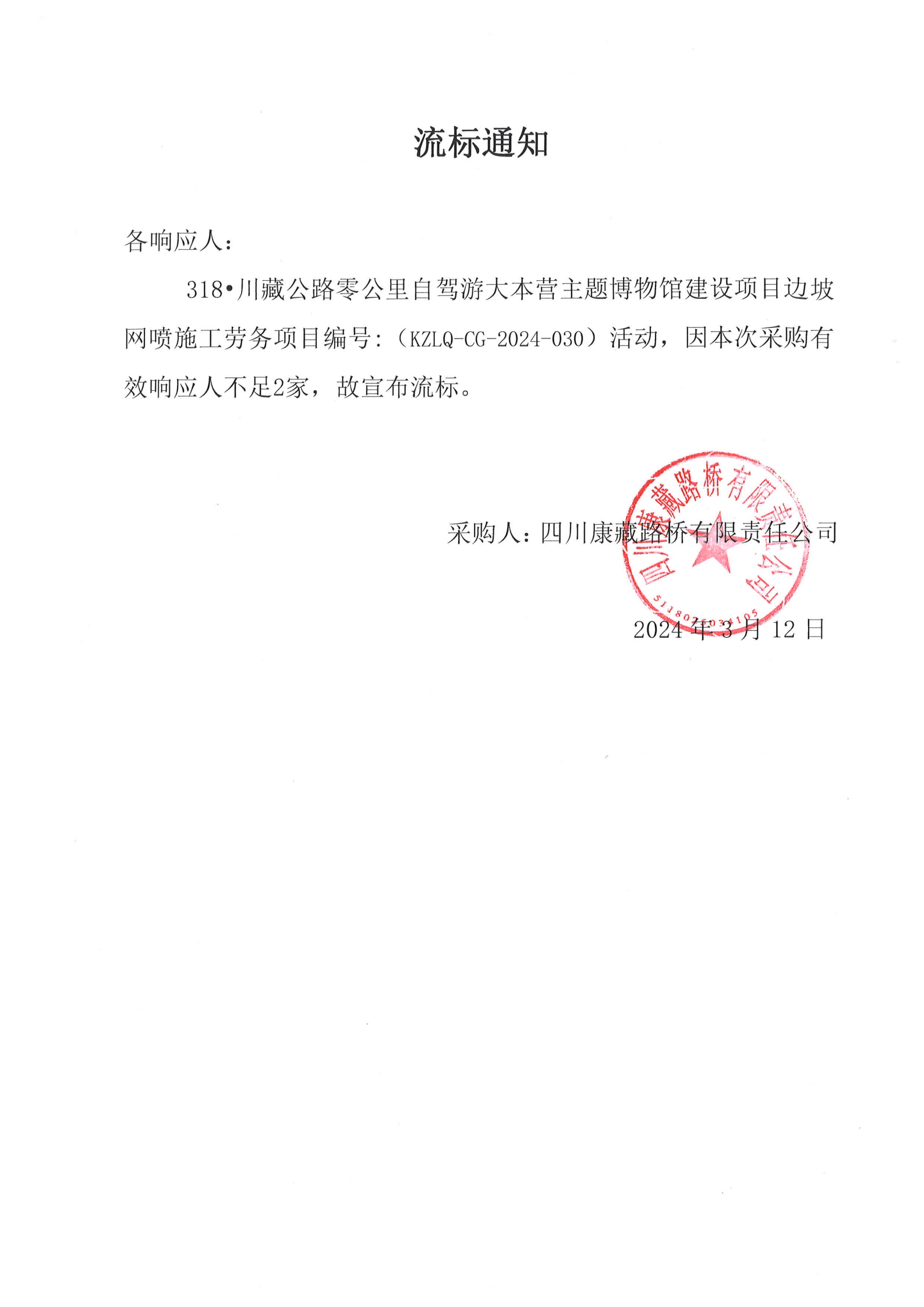 四川康藏路橋有限責(zé)任公司318·川藏公路零公里自駕游大本營主題博物館建設(shè)項(xiàng)目邊坡網(wǎng)噴施工勞務(wù)流標(biāo)通知