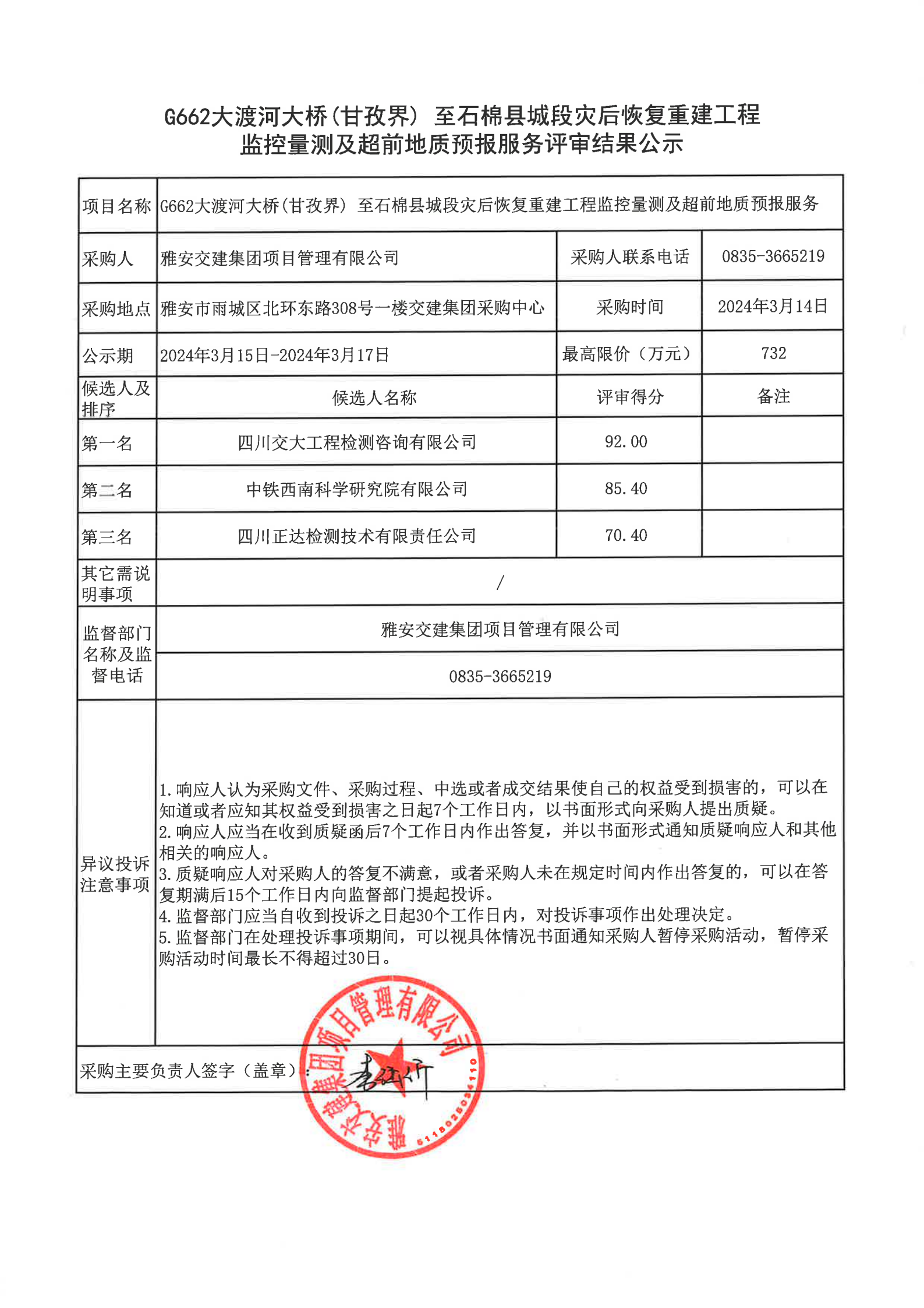 雅安交建集團項目管理有限公司G662大渡河大橋(甘孜界)至石棉縣城段災(zāi)后恢復重建工程監(jiān)控量測及超前地質(zhì)預(yù)報服務(wù)評審結(jié)果公示
