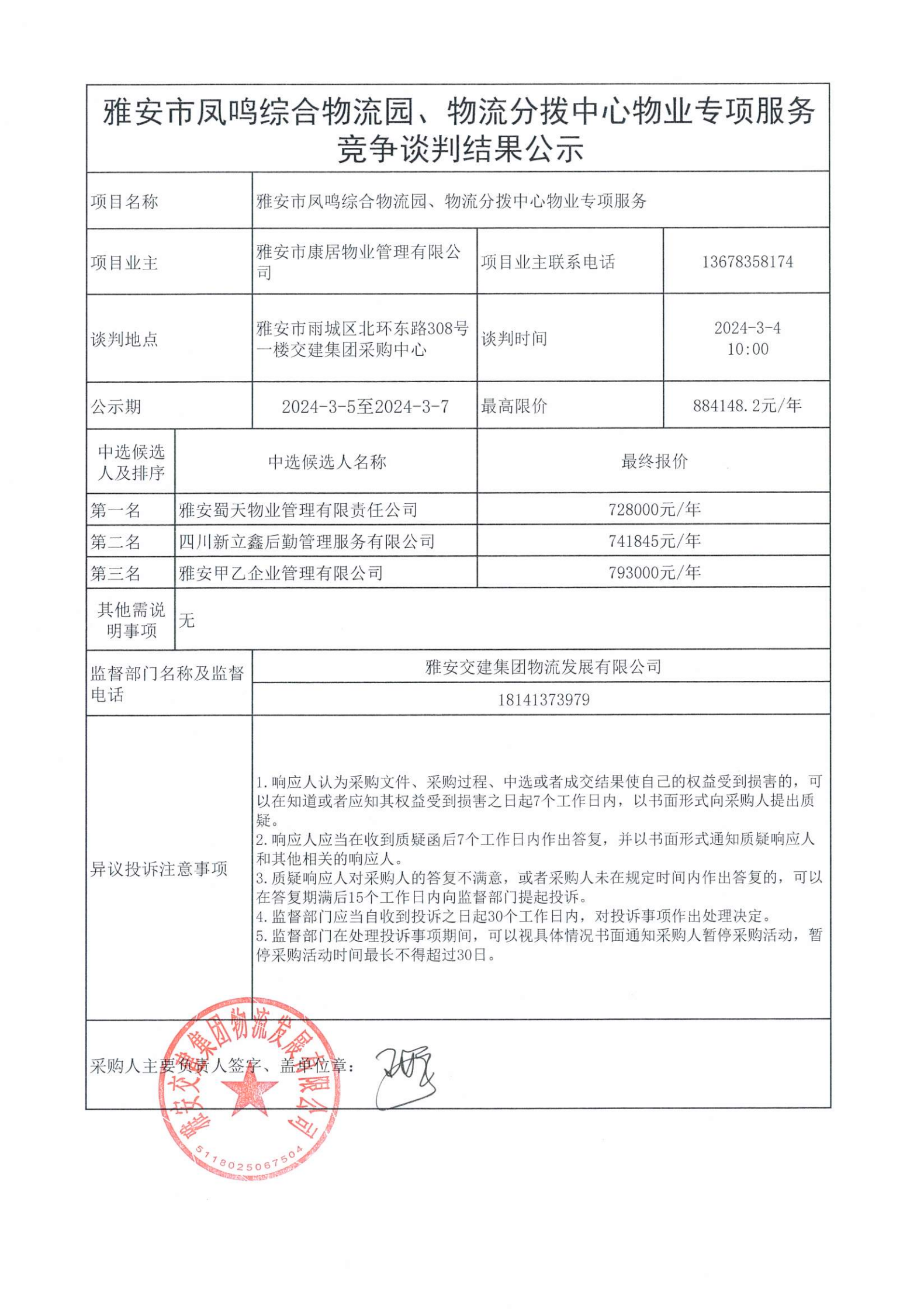 雅安市康居物業(yè)管理有限公司雅安市鳳鳴綜合物流園、物流分撥中心物業(yè)專(zhuān)項(xiàng)服務(wù)競(jìng)爭(zhēng)談判結(jié)果公示