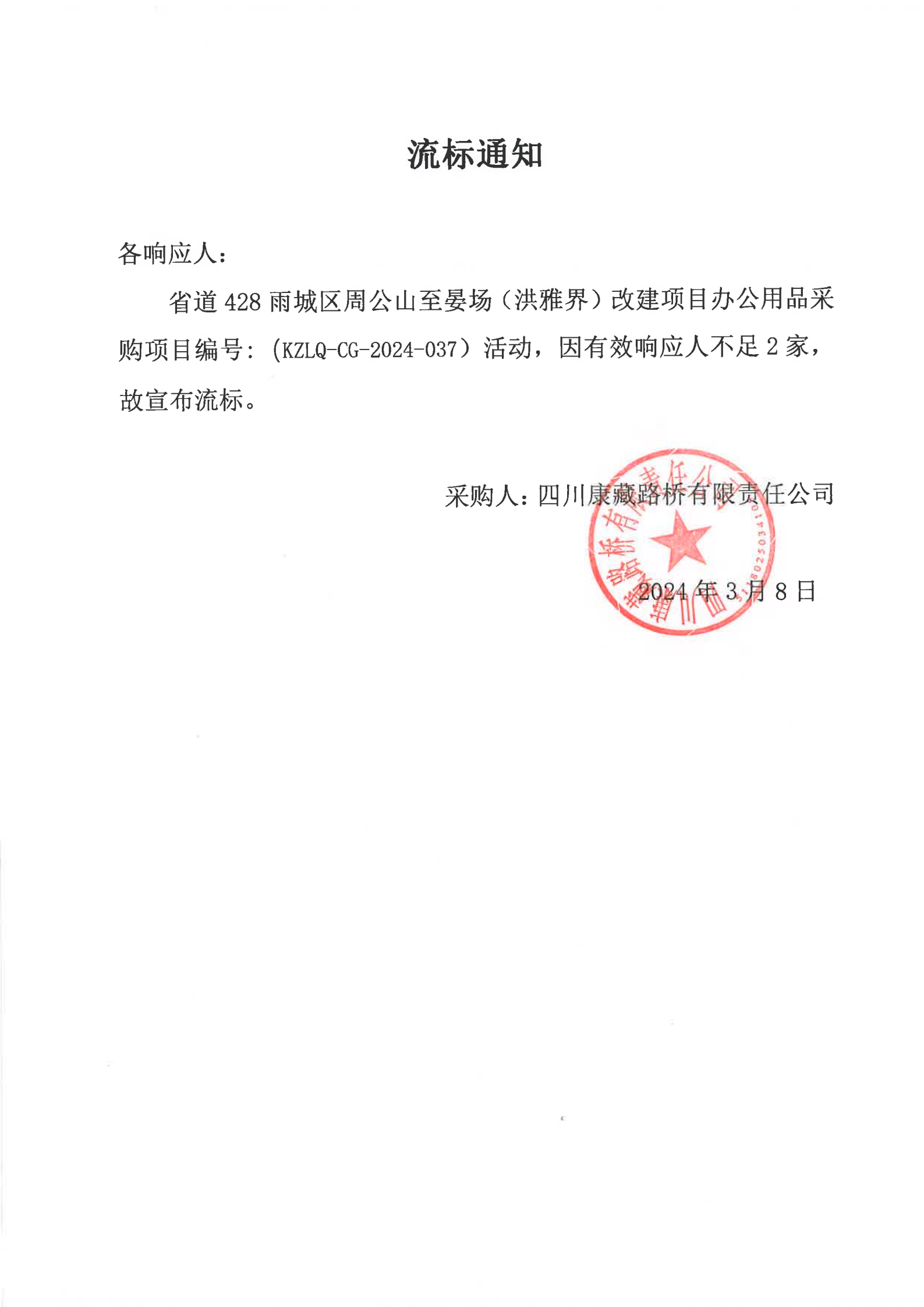 四川康藏路橋有限責(zé)任公司省道428雨城區(qū)周公山至晏場(chǎng)(洪雅界)改建項(xiàng)目辦公用品采購(gòu)流標(biāo)通知