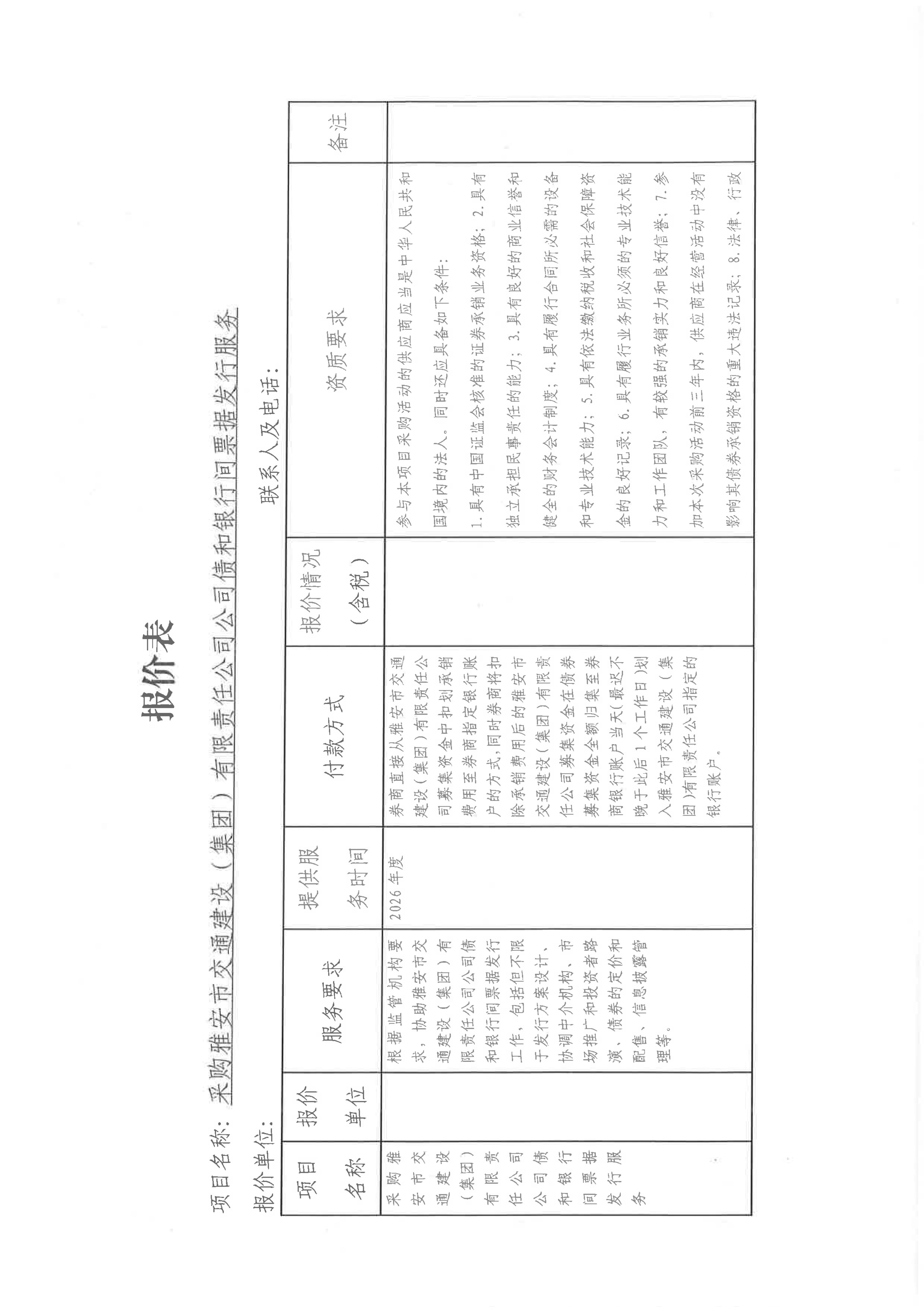 關(guān)于采購雅安市交通建設(集團)有限責任公司發(fā)行公司債和發(fā)行銀行間票據(jù)所需券商服務限價的詢價函