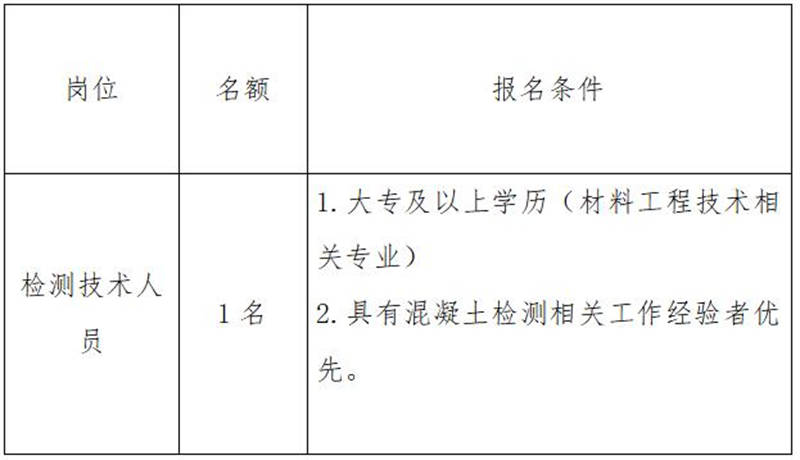 雅安交建集團康居建設(shè)工程質(zhì)量與室內(nèi)環(huán)境污染檢測有限公司是雅安市交通建設(shè)(集團)有限責(zé)任公司下屬子公司,主要從事民用建筑室內(nèi)環(huán)境污染檢測業(yè)務(wù),F(xiàn)根據(jù)公司業(yè)務(wù)發(fā)展需要,擬向社會公開招聘1名技術(shù)檢測人員,現(xiàn)將有關(guān)事項公告如下: