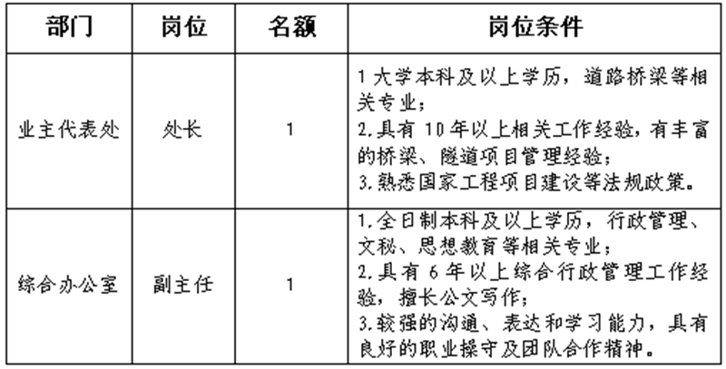 根據(jù)發(fā)展需要,決定面向社會(huì)公開(kāi)招聘雅安市交通建設(shè)(集團(tuán))有限責(zé)任公司(以下簡(jiǎn)稱“雅安交建集團(tuán)”)所屬子公司相關(guān)人員2名,現(xiàn)將有關(guān)事項(xiàng)公告如下: