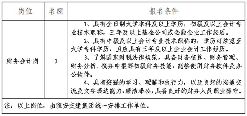 根據(jù)發(fā)展需要,決定面向社會公開招聘雅安市交通建設(shè)(集團)有限責任公司(以下簡稱“雅安交建集團”)所屬子公司財務工作人員3名,現(xiàn)將有關(guān)事項公告如下: