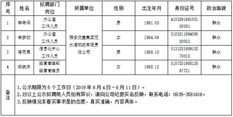 雅安交建集團所屬子公司擬聘用人員公示(無水港公司)